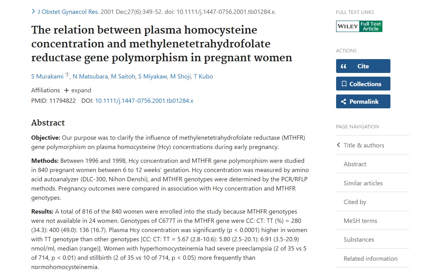 2002an, Japoniako kohorte-azterketa handi bat (840 emakumeak, 6-12 asteko haurdunaldia) The Journal of Obstetrics aldizkarian argitaratua eta Ginekologia Ikerketak katea sendotu zuen: TT → Hcy igoera → haurdunaldi txarra emaitzak.