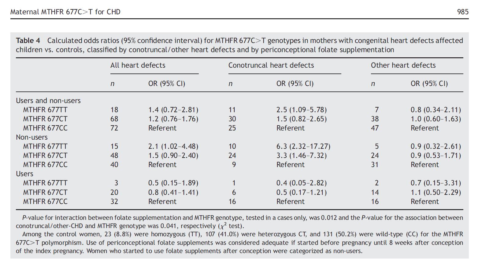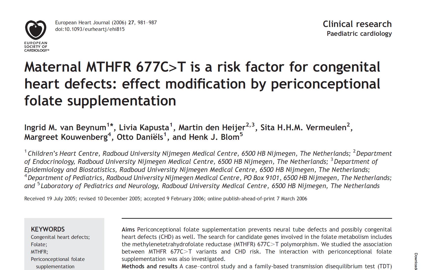 Sortzetikotasuna duten 165 familien artean bihotzeko gaixotasunak (CHD) eta 220 kontrol-familia, MTHFR 677 eraman zuten amak CT edo TT genotipoa eta EZ zuten folato osagarri perikontzeptiborik hartu askoz litekeena da kondukzio motako bihotz-akatsak dituen haur bat edukitzea (OR 3.3 eta 6.3, hurrenez hurren).