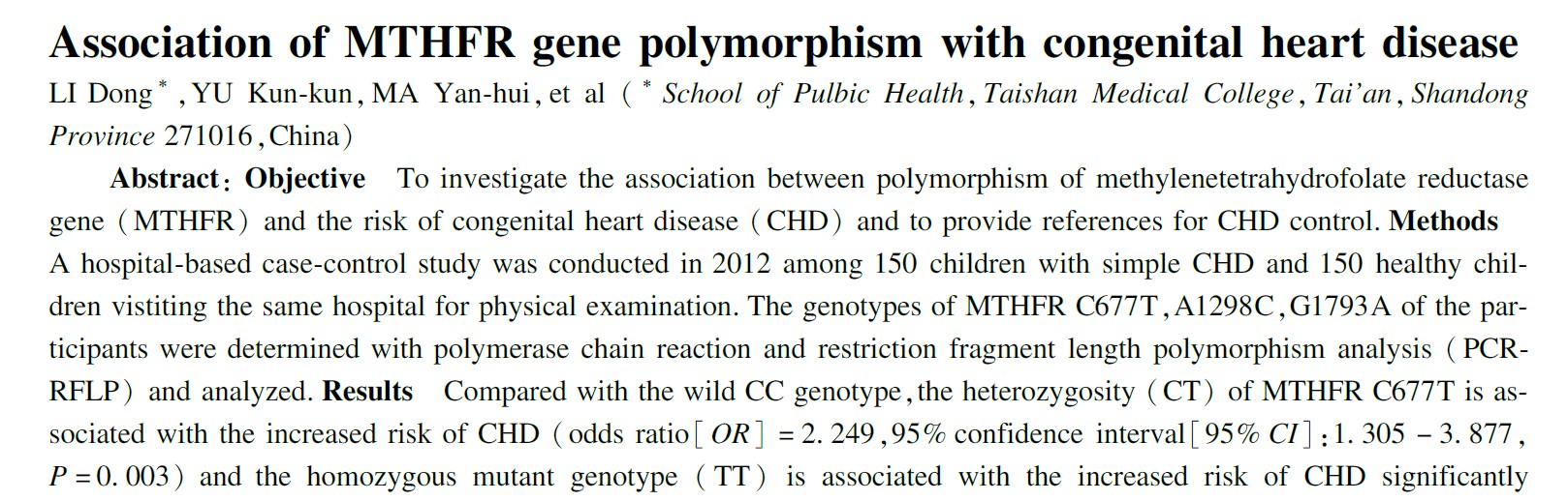 Shandong-eko Qilu Haurren Ospitaleko ikerketa bat Unibertsitateak MTHFR C677T-ren T aleloak CHD probabilitateak 1,8 aldiz handitzen dituela erakutsi zuen; TT eta CT genotipoek arriskua 3,1 eta 2,2 bidertzera bultzatzen dute.