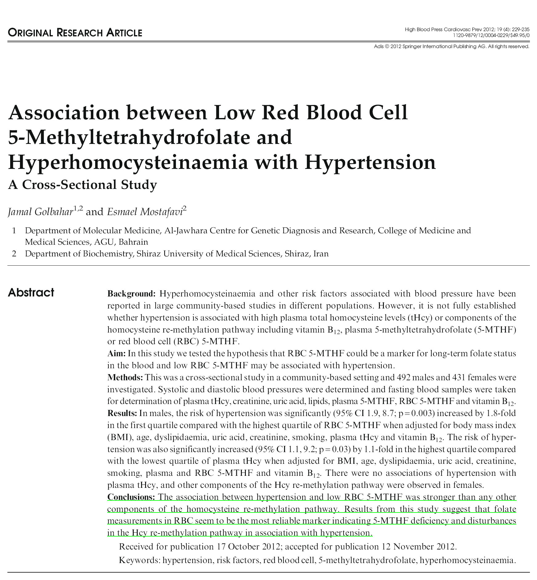 [1] Globulu gorri baxuko 5-metiltetrahidrofolatoaren eta hiperhomozisteinemia hipertentsioarekin duen lotura. *High Blood Press and Cardiovascular Prevention*, 2012.